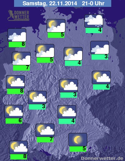Am Abend werden die Wolken im Norden meist noch dichter, dabei kann vor allem in den Küstenbereichen gelegentlich etwas Regen fallen, sonst bleibt es meist trocken. Weiter nach Süden bleibt es dagegen bei lockerer bis aufgelockerter Bewölkung durchweg trocken. Im Südosten des Landes wird es gebietsweise sternenklar. Die Abendtemperatur liegt bei 8 Grad in Aachen und etwa 3 Grad in Berlin.