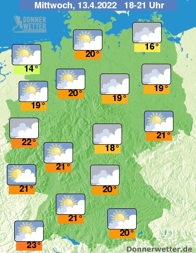 Heute Abend ist es gebietsweise stark oder dicht bewölkt, jedoch zeigen sich in weiten Landesteilen auch heitere Abschnitte, dabei bleibt es trocken. Die Temperatur liegt bei 14 Grad in Wilhelmshaven und bis 23 Grad in Freiburg.