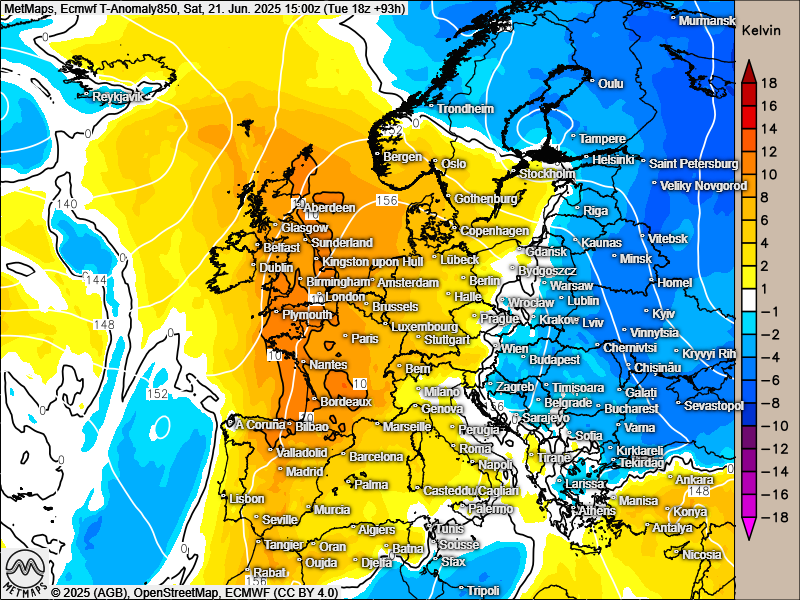 Die Karte bildet die Temperaturanomalie am Samstagnachmittag (15.00 Uhr) nach dem europäischen Wettermodell ECMWF ab.