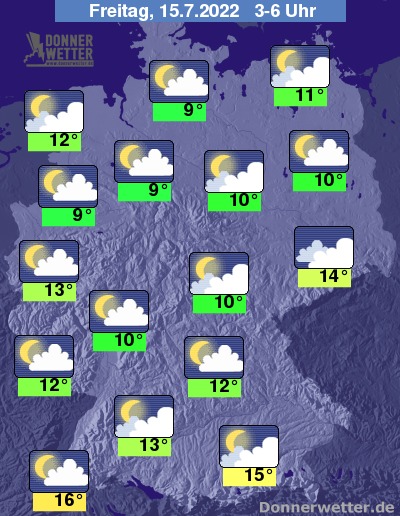 In der bevorstehenden Nacht sind im Süden bei teils dichten Wolken lokale Schauer möglich, sonst ist es schon meist locker bewölkt und dazu trocken. Im weiteren Nachtverlauf klart der Himmel in weiten Landesteilen auf, vor allem im Süden bleibt es aber auch oft stark bewölkt. Die Temperatur sinkt auf 16 Grad in Freiburg und etwa 9 Grad in Hamburg.