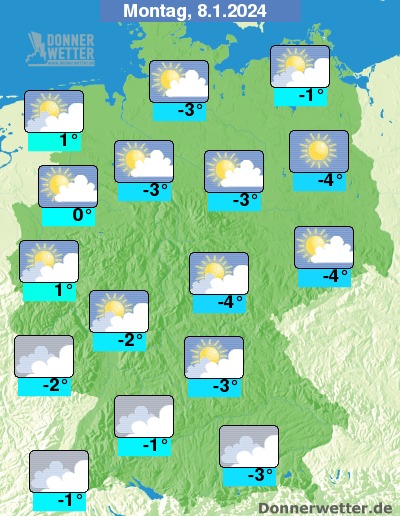 Die Temperaturen erreichen Höchstwerte um -4 Grad in Brandenburg, -2 Grad im Saarland und 1 Grad am Niederrhein.