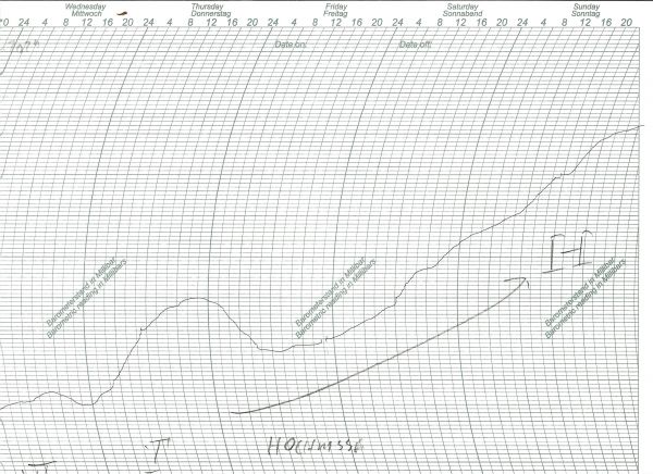 Es geht aufwärts - zwar nicht bei den Temperaturen, dafür beim Luftdruck: Der Schrieb zeigt den Luftdruckverlauf zwischen dem 03.01. und dem 07.01.2024 an unserer Wetterstation in Bonn: