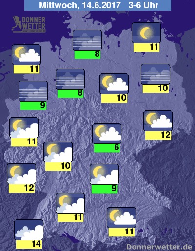 In der Nacht zum Mittwoch zeigt sich der Himmel über der Nordosthälfte Deutschlands oft sternenklar und ansonsten nur locker bewölkt. Deutlich mehr, jedoch weitgehend aufgelockerte Wolken ziehen hingegen über den Westen, Südwesten und Süden der Republik hinweg, diese bringen allerdings keinen Regen. Die Temperatur sinkt auf 14 Grad in Freiburg und bis 6 Grad im Thüringer Becken.
