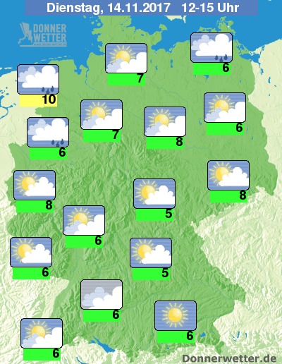 Heute Nachmittag ziehen im Norden und Westen dichte Wolken auf, die hier zeitweiligen Regen bringen. Weiter nach Südosten hin scheint zwischen den teils lockeren, teils noch aufgelockerten Wolken häufig auch die Sonne und es bleibt trocken. Die Temperatur liegt bei 5 Grad im Thüringer Becken und etwa 10 Grad im nördlichen Emsland. An der Ostsee weht ein teils starker Wind.