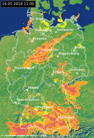 Zum Teil kräftige Niederschläge bestimmen die nächsten Stunden vor allem in der Südhälfte des Landes. Südlich des Mains, besonders im Alpenvorland, muss regional mit Dauerregen gerechnet werden; ein weiteres größeres Niederschlagsband zieht aktuell über Teile NRWs und Niedersachsens hinweg.
