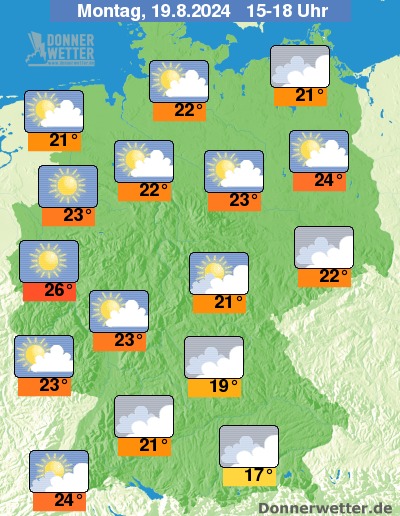 Am Montagnachmittag zeigt sich der Himmel über dem Südosten wechselnd oder stark bewölkt, es bleibt aber meist trocken. In den übrigen Landesteilen startet die neue Woche meist heiter bis wolkig, im Westen ist es auch längere Zeit sonnig, und es bleibt trocken.