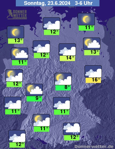 Die Temperaturen gehen in den Frühstunden zurück auf Werte um 16 Grad in der Lausitz und 8 Grad im Thüringer Becken.