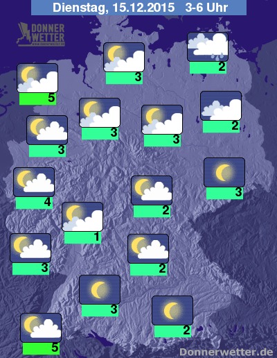 In der Nacht zum Dienstag halten sich über dem Nordosten weiterhin meist dichte Wolken und es fällt zeitweise Regen oder Sprühregen, teils mischen sich auch einige Flocken in den Regen. Im Süden Deutschlands sowie in Sachsen zeigt sich der Himmel meist sternenklar. Im übrigen Bundesgebiet ist es locker oder aufgelockert bewölkt, dazu bleibt es trocken. Die Temperatur sinkt auf 5 Grad an der Nordseeküste und bis 1 Grad am Westerwald.