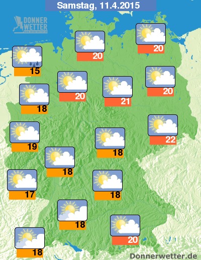 Der Samstag zeigt sich nach den derzeitigen Modellläufen verbreitet heiter mit meist lockere, teils aber auch aufgelockerter Bewölkung, dazu bleibt es voraussichtlich weitgehend trocken. Ein kleines Schauer- und Gewitterrisiko besteht jedoch in den westlichsten Landesteilen, hier sind die Wolken zeitweise auch mal dichter. Die Temperatur steigt auf häufig frühsommerliche Werte zwischen 15 Grad an der Nordsee und 22 Grad in Dresden.