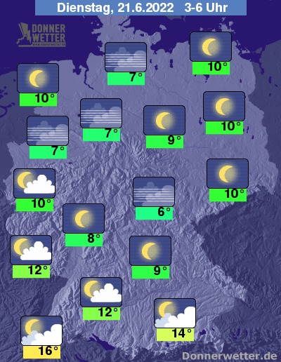 In der Nacht zum Dienstag zeigt sich der Himmel verbreitet sternenklar, vor allem im Süden sind anfangs noch oft einige und zum Teil dichte Wolken möglich, hier sind örtliche Schauer zu erwarten. Im übrigen Land bleibt es trocken bei Tiefstwerten von 16 Grad in Freiburg und bis 6 Grad in Erfurt.