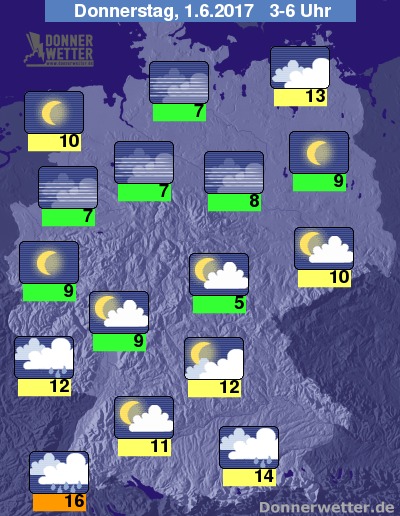 In der folgenden Nacht fällt im Stau der Alpen oft gewittriger Regen, auch im übrigen Süden ist es teils stark, teils aufgelockert bewölkt, dabei jedoch weitgehend trocken. Weiter nach Norden hin zeigt sich der Himmel dagegen verbreitet sternenklar, dazu bleibt es trocken. Die Temperatur sinkt auf milde 16 Grad in Freiburg und auf deutlich kühlere 5 Grad im Thüringer Becken.