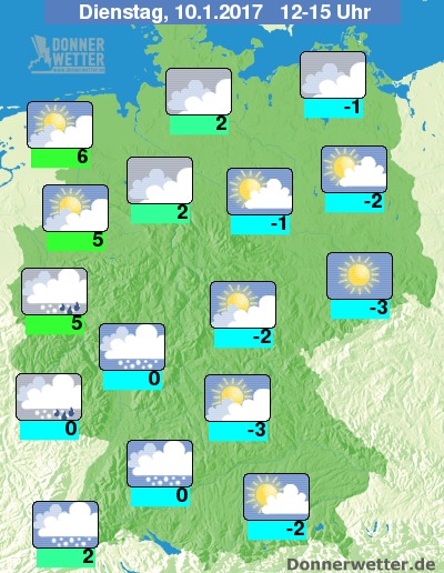Heute Nachmittag halten sich über der Westhälfte Deutschlands meist dichte Wolken und besonders vom Südwesten bis in den Westen des Landes fällt zeitweise Regen, Schneeregen oder Schnee, dabei besteht hier vielerorts Glättegefahr! Vom Südosten, über den Osten bis in den Nordosten hinein herrscht hingegen oft heiteres, zum Teil aber auch wolkiges Wetter vor, dabei bleibt es trocken. Die Temperatur steigt auf -3 Grad im Vogtland und bis 6 Grad an der Nordsee.