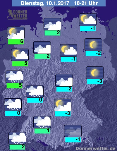 Heute Abend ziehen vom Südwesten bis nach Westdeutschland dichte Wolken mit zeitweiligen Schneefällen, zum Teil auch mit Schneeregen oder Regen hinweg, dabei ist mit erhöhter Glättegefahr zu rechnen! Wechselnd bis stark bewölkt ist es in der übrigen Westhälfte. Weiter nach Osten hin zeigt sich der Himmel hingegen zunehmend locker bewölkt oder auch sternenklar, dabei bleibt es trocken. Die Temperatur liegt bei -3 Grad in Chemnitz und um 6 Grad im nördlichen Emsland.