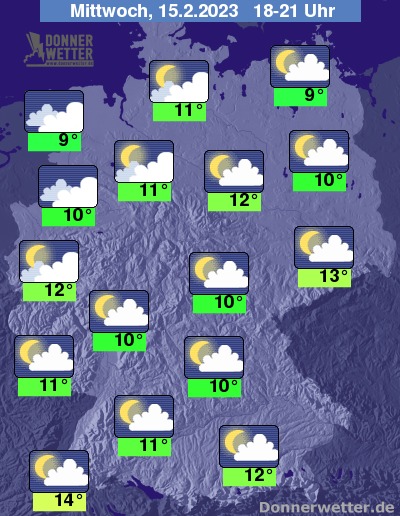 Heute Abend nimmt der Wolkenanteil insgesamt etwas zu, es bleibt jedoch größtenteils bei geringer bis lockerer Bewölkung. Mehr und teils dichte Wolken ziehen über den Westen und Nordwesten des Landes, dazu bleibt es trocken. Die Temperatur liegt bei 9 Grad in Neubrandenburg und bis 14 Grad in Freiburg.
