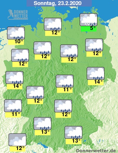 Am Sonntag bleibt es verbreitet bedeckt und es fällt zeitweise, gebietsweise auch langanhaltender Regen. Die Temperatur steigt auf nasskalte 5 Grad in Stralsund und bis zu 14 Grad im Rheinland. Der Wind weht im Tagesverlauf vielerorts stark bis stürmisch.