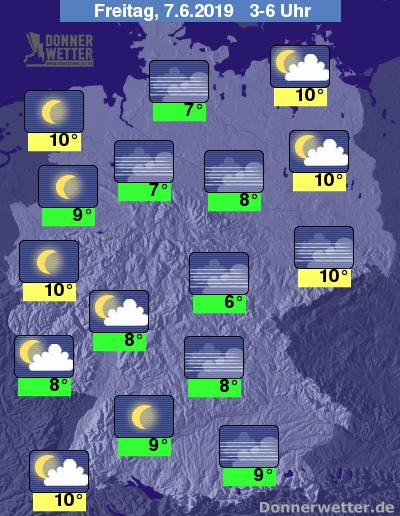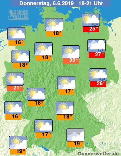 Die Temperaturen liegen am frühen Abend im Nordosten, dort wo es noch längere Zeit trocken blieb zwischen 22 und 27 Grad. Sonst werden nur noch 16 bis 21 Grad erreicht.