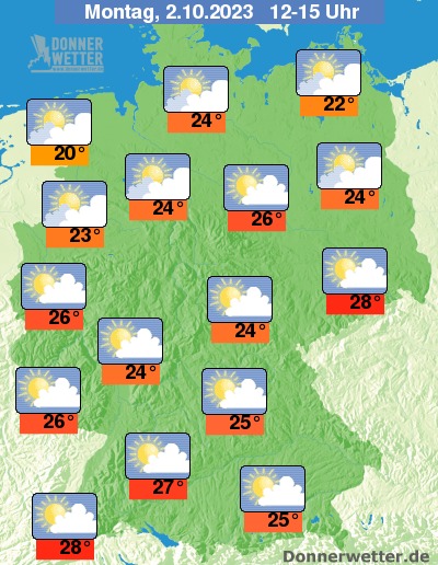 Heute Nachmittag ist es im Norden oft stark, gebietsweise aber auch wechselnd bis aufgelockert bewölkt. Weiter nach Süden hin scheint dagegen verbreitet die Sonne und es ziehen meist nur wenige Wolken durch. Es bleibt überall trocken bei 20 Grad an der Nordsee und bis 28 Grad in der Lausitz.
