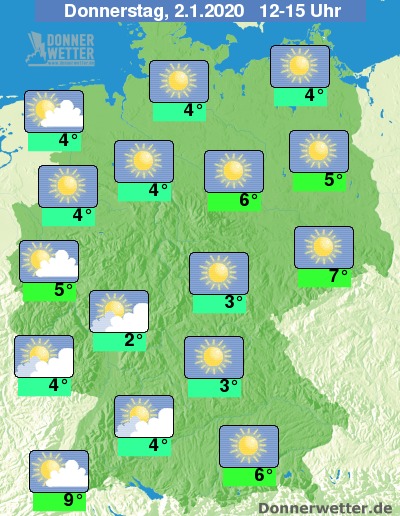 Am frühen Nachmittag strahlt abgesehen lokaler Nebel- oder Hochnebelfelder verbreitet die Sonne von einem blauen oder nur leicht bewölkten Himmel. Im Südwesten nimmt die Bewölkung allmählich zu.