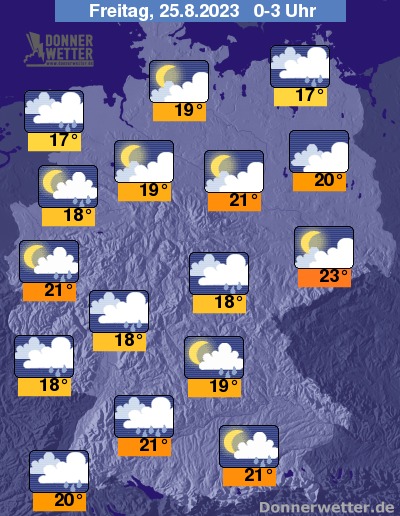 In der Nacht zeigt sich der Himmel meist wechselnd oder stark bewölkt, dabei muss verbreitet mit Schauern und einzelnen Gewittern gerechnet werden.