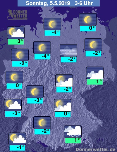 In der Nacht zum Sonntag fällt an den Alpen und am Bayerischen Wald noch zeitweise Schnee oder Schneeregen, auch im übrigen Süden und Osten bleibt es noch meist stark bewölkt, aber weitgehend trocken. Über dem Rest der Republik ist es dagegen weitgehend sternenklar, dazu bleibt es trocken. Die Temperatur sinkt auf 3 Grad an der Nordsee und bis -4 Grad in der Norddeutschen Tiefebene.