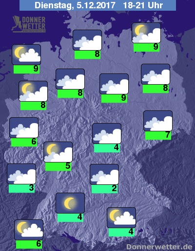 Heute Abend ist es über dem Alpenvorland meist sternenklar. Im Westen und übrigen Süden ist es teils aufgelockert, teils stark bewölkt und trocken. Im Rest der Republik halten sich meist dichte Wolken aus denen aber nur selten etwas Regen fällt. Die Temperatur liegt zwischen 2 und 9 Grad. An den Küsten ist es oft stürmisch.