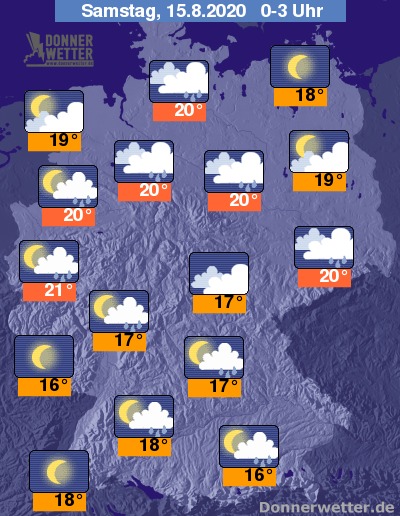 In der Nacht auf Samstag regnet es zunächst noch über weiten Landesteilen. An Weser und Elbe sowie im Südosten  ist dabei überwiegend stark bewölkt oder bedeckt; in den übrigen Landesteilen wechselt sich lockere oder aufgelockerte Bewölkug ab, am Oberrhein und an der Ostseeküste kann es auch aufklaren.