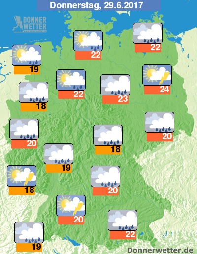 Abgesehen von kurzen Aufheiterungsphasen dominieren in Deutschland die Wolken. Häufig muss mit Schauern gerechnet werden. Im Süden und Osten drohen kräftige Regenfälle, teilweise auch von Blitz und Donner begleitet. Hierbei kann es zu kleinräumigen Überschwemmungen kommen. Die Höchsttemperaturen erreichen noch 18 bis 25 Grad.