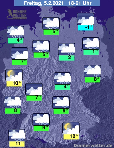 In den Abendstunden bleibt der Himmel über weiten Landesteilen bedeckt, zwischen Münsterland und Rheinland kann es zeitweise auch mal auflockern. Verbreitet muss in den Abendstunden mit teils ergiebigem Niederschlag gerechnet werden, der im norddeutschen Tiefland auch als Schneeregen oder Schnee fallen kann. Regional ist Straßenglätte möglich.