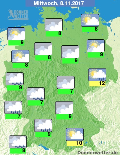 Im Südwesten hält sich dichte Schichtbewölkung, aus der es gelegentlich tröpfeln oder nieseln kann. Ein weiteres kleines Niederschlagsfeld zieht aus Tschechien heraus, über Sachsen-Anhalt und Niedersachsen hinweg und erreicht zum Abend die Deutsch Bucht. Auch sonst hält sich meist eine zähe Wolkendecke, die nur stellenweise auflockert und einige Sonnenstrahlen hindurch lässt. Regen fällt dabei aber wohl nicht. Bei einem meist schwachen Wind liegen die Höchsttemperaturen zwischen 5 und 10 Grad. Lediglich in Sachsen könnten mit etwas sonniger Unterstützung auch 12 Grad erreicht werden.