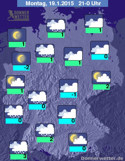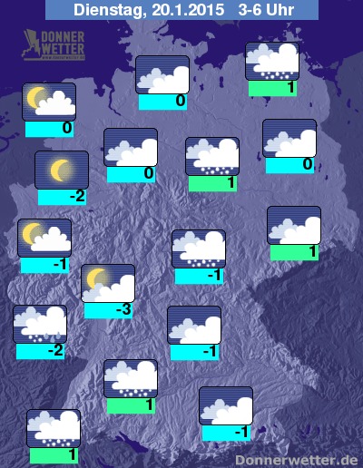 In der Nacht zum Dienstag fällt unter dichten Wolken, in einem breiten Streifen von Südwest- bis nach Nordostdeutschland zeitweise Schnee, gebietsweise auch Schneeregen oder Regen, dabei ist Vorsicht auf den Straßen geboten. Südöstlich des Niederschlagbandes ist es ebenfalls stark bewölkt, jedoch trocken, nordwestlich hingegen ist es oft locker oder aufgelockert bewölkt, teils auch sternenklar und weitgehend trocken. Die Temperatur sinkt auf 1 Grad in Rostock und bis -3 Grad am Taunus.
