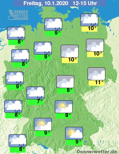 Am frühen Nachmittag fällt im Westen und Norden gelegentlich Regen oder Sprühregen, sonst trocknet die Luft etwas ab. Im Süden wechseln sich Sonne und Wolken miteinander ab.