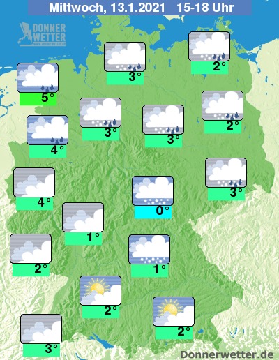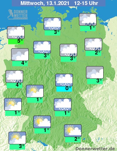 Am frühen Nachmittag dominieren im Norden und in der Mitte dichte Wolken und zeit- und gebietsweise fällt Schnee oder Schneeregen, zum Teil schauerartig verstärkt. Insbesondere in höheren Lagen besteht Glättegefahr. Im Süden und Südwesten bleibt es überwiegend trocken und gelegentlich lässt sich die Sonne zwischen den Wolken blicken.