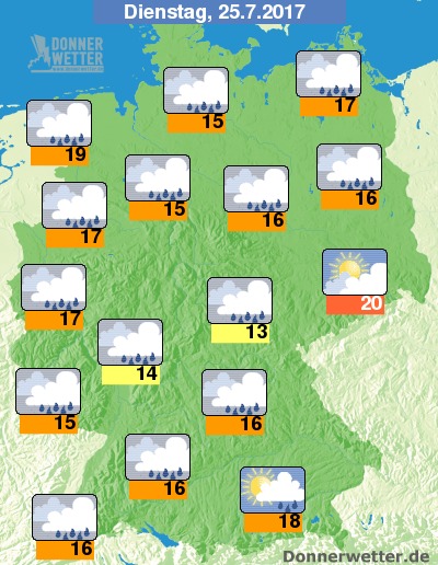 Kompakte Wolken sorgen in vielen Landesteilen wieder für teils kräftigen Regen und Schauer, örtlich blitzt und donnert es auch wieder. Außerdem kann es regional wieder zu kleinräumigen Überschwemmungen kommen. Im Laufe des Nachmittags wird es von Sachsen bis ins südliche Brandenburg etwas freundlicher und trocken. Die Höchsttemperaturen bewegen sich meist bei kühlen 14 bis 20 Grad.