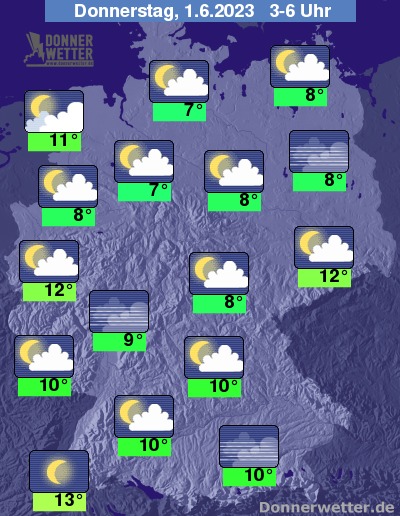 In der Nacht zum Donnerstag zeigt sich der Himmel oft locker bewölkt oder auch sternenklar. Bei Tiefstwerten von 13 Grad in Freiburg und 7 Grad in Hannover bleibt es landesweit trocken.