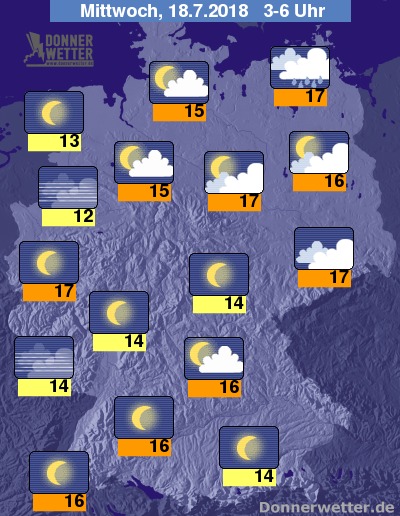 In der Nacht zum Mittwoch klingen letzte Schauer im Umfeld des Rheins und im Alpenvorland meist rasch ab und der Himmel klart wie schon im übrigen Bundesgebiet überwiegend auf. Dichte Wolken halten sich jedoch im Nordosten und im östlichen Brandenburg, dazu fällt hier gebietsweise auch Regen. Die Temperatur sinkt auf 17 Grad in Dresden und bis 12 Grad am Niederrhein.