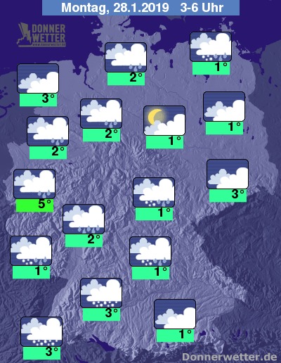 In der Nacht zum Montag zieht weitgehend dichte Bewölkung durch, dazu fällt mit Ausnahme des Ostens und Südostens zeitweise Regen, zunehmend auch Schneeregen oder Schnee. Die Temperatur sinkt auf 5 Grad in Köln und bis 1 Grad in München.
