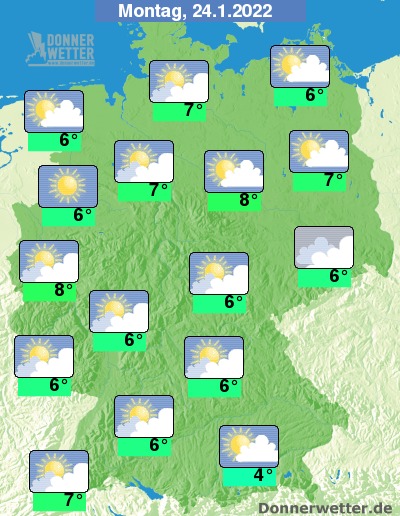 Am Montag halten sich teilweise dichte Wolken oder es ist trüb, gebietsweise zeigen sich jedoch auch Aufheiterungen, dabei bleibt es trocken. Die Temperatur steigt auf 4 Grad in München und bis 8 Grad in Düsseldorf.