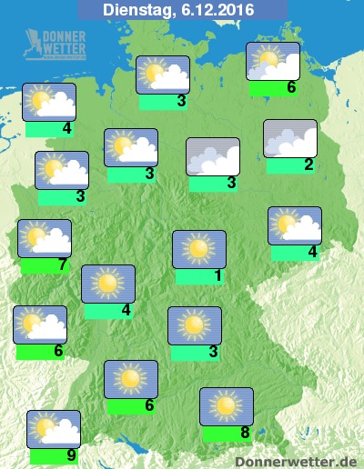 Am Dienstag ziehen über den Nordosten oft dichte Wolken, dabei ist hier und da auch etwas Regen möglich, sonst ist es hingegen überwiegend heiter bis sonnig und auch trocken. Es werden 1 bis 9 Grad erreicht.