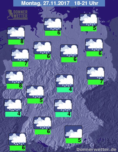 Heute Abend liegt das gesamte Land unter einer geschlossenen Wolkendecke und einzig am Alpenrand bleibt es noch trocken, sonst fällt verbreitet, zum Teil langanhaltender Regen, nach Süden hin auch mit Schnee vermischt. Die Temperatur liegt bei 4 Grad im Thüringer Becken und 8 Grad an der Ems. An der Nordsee weht ein zunehmend starker und teils stürmischer Wind.