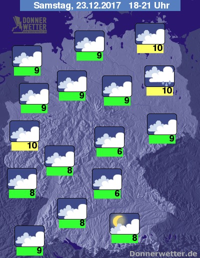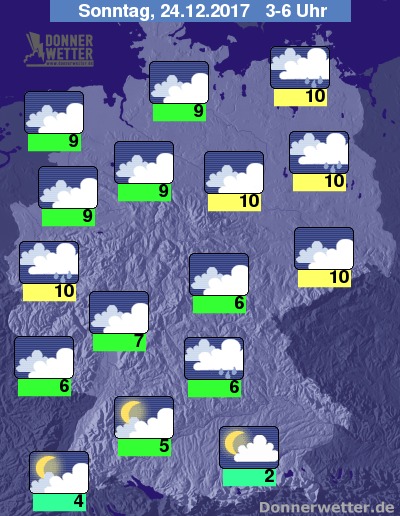 An Heiligabend kann sich im Alpenvorland häufig die Sonne zwischen meist lockeren Wolken zeigen, dazu bleibt es trocken. Weiter nach Norden hin werden die Wolken immer dichter und vor allem über der Nordhälfte Deutschlands fällt zeitweise Regen. Die Temperaturen steigen auf milde 7 bis 11 Grad.