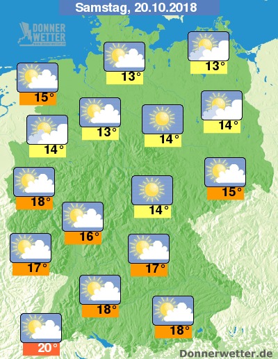 Heute zeigt sich das Wetter im Norden zum Teil locker bis aufgelockert, teils aber auch stark bewölkt. Im übrigen Bundesgebiet ziehen teils einige Wolken durch, häufig ist es aber auch heiter bis sonnig. Es bleibt landesweit trocken bei Werten zwischen 13 Grad an der Ostsee und bis zu 20 Grad in Freiburg.