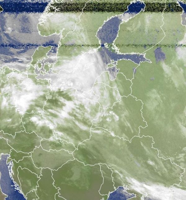 Auf dem Satellitenfoto von heute Nachmittag erkennen wir oft viele Wolken über weiten Teilen von Mittel- bis nach Osteuropa, sie gehören zu einem Tief über Skandinavien und brachten besonders über der Ostsee auch teils anhaltenden Regen.