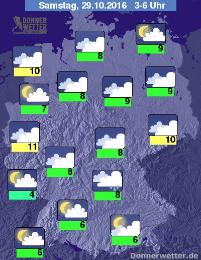 In der folgenden Nacht ist es im Süden und Südwesten, gebietsweise auch im Westen sowie im Ostseeumfeld locker oder aufgelockert bewölkt und dazu trocken. In den anderen Landesteilen bleibt es jedoch stark bewölkt und hier und da sind auch ein paar Tropfen möglich, meist bleibt es aber trocken. Die Temperatur sinkt auf 11 Grad in Köln und bei Aufklaren bis 4 Grad im Saarland.