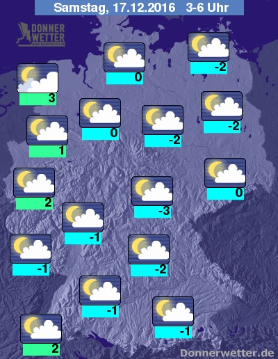 In der folgenden Nacht bleibt es am Himmel verbreitet locker, im Umfeld von Nord- und Ostsee meist wechselnd bis aufgelockert bewölkt, dazu bleibt es trocken. Die Temperatur sinkt auf 3 Grad im nördlichen Emsland und bis auf -3 Grad am Thüringer Wald.