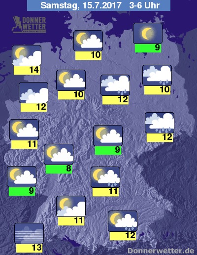 In der Nacht zum Samstag sind über der Osthälfte Deutschlands noch gebietsweise Schauer unterwegs, die sich zum Morgen hin in den Südosten des Landes und nach Sachsen zurückziehen. Weiter nach Westen hin zeigt sich der Himmel hingegen verbreitet locker bis aufgelockert, nur hier und da auch stärker bewölkt, dabei bleibt es weitgehend trocken. Die Temperatur sinkt auf 14 Grad in Emden und bis 8 Grad am Westerwald.