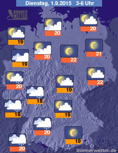 In der kommenden Nacht ziehen im Südwesten und Westen der Bundesrepublik dichte Wolken auf, dabei fällt teils starker und gewittriger Regen. Im Norden und Nordwesten ist es meist aufgelockert, teils auch stark bewölkt, aber meist trocken. In den übrigen Landesteilen bleibt der Himmel weitgehend locker bewölkt oder klar und dazu trocken. Die Temperatur sinkt auf 22 Grad in Leipzig und bis 18 Grad im Saargau.
