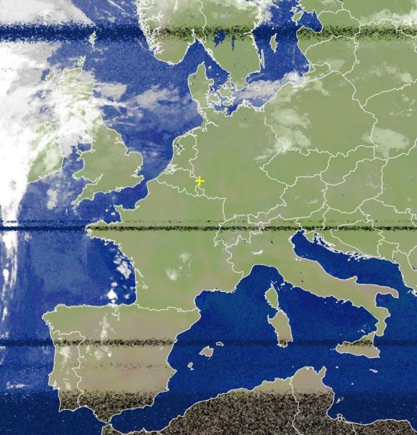 Auf dem Satellitenfoto von heute Morgen erkennen wir kompakte Bewölkung über weiten Teilen von Irland und Schottland, sie gehört zu einem Tief westlich der Britischen Inseln und brachte in den Regionen zum Teil starken und auch anhaltenden Regen.