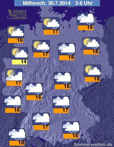 In der kommenden Nacht treten verbreitet weitere Schauer und Gewitter auf, dabei sind gebietsweise aber auch lange Trockenphasen möglich, ganz trocken bleibt es voraussichtlich im Nordseeumfeld. Die Temperatur sinkt auf 19 Grad in Neubrandenburg und etwa 14 Grad im Münsterland.