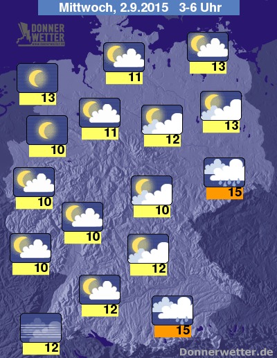 In der Nacht zum Mittwoch fällt im Süden und Osten Deutschlands zeitweise weiterer Regen. Er zieht sich bis zum Morgen aber meist ins Voralpenland zurück und im Osten klingt er nach und nach komplett ab. Im Norden und Westen des Landes zeigt sich der Himmel verbreitet sternenklar oder nur locker bewölkt, aber auch in den übrigen Landesteilen ist es zumeist locker bewölkt, gebietsweise aber auch noch aufgelockert bewölkt, dazu jedoch ebenso trocken. Die Temperatur sinkt auf 15 Grad in München und etwa 10 Grad am Niederrhein.