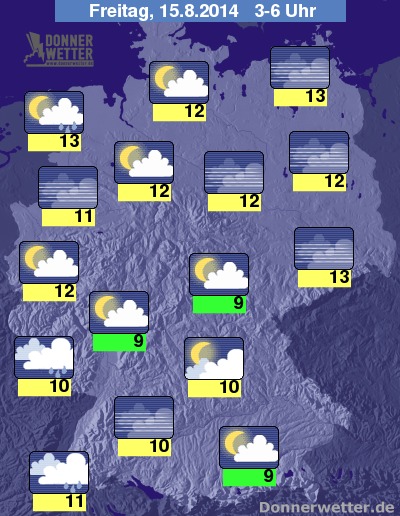 In der kommenden Nacht klingen die einzelnen Schauer meist nach und nach ab, während die Bewölkung im Westen und Südwesten noch dichter wird, und es gelegentlich regnet, sonst bleibt es bei meist aufgelockerter Bewölkung überwiegend trocken. Stellenweise bildet sich Nebel. Die Temperatur sinkt auf 13 Grad in Rostock und etwa 9 Grad im Odenwald.